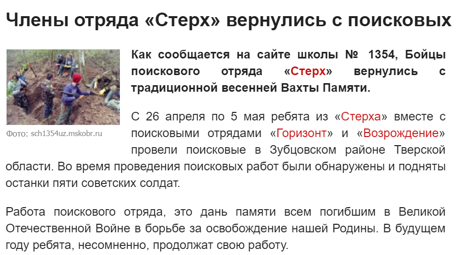 Как сообщается на сайте школы № 1354, Бойцы поискового отряда «Стерх» вернулись с традиционной весенней Вахты Памяти.