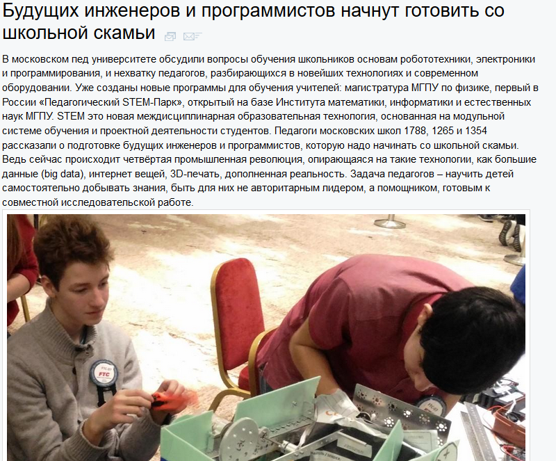 В московском пед университете обсудили вопросы обучения школьников основам робототехники, электроники и программирования, и нехватку педагогов, разбирающихся в новейших технологиях и современном оборудовании. Уже созданы новые программы для обучения учителей: магистратура МГПУ по физике, первый в России «Педагогический STEM-Парк», открытый на базе Института математики, информатики и естественных наук МГПУ. STEM это новая междисциплинарная образовательная технология, основанная на модульной системе обучения и проектной деятельности студентов. Педагоги московских школ 1788, 1265 и 1354 рассказали о подготовке будущих инженеров и программистов, которую надо начинать со школьной скамьи.