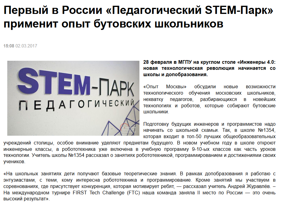 Первый в России «Педагогический STEM-Парк» применит опыт бутовских школьников