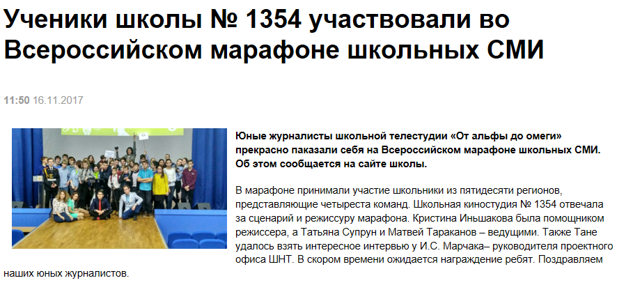 Ученики школы № 1354 участвовали во Всероссийском марафоне школьных СМИ